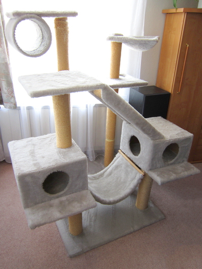 kaparófát is kaptam a gazditól. Rendkívüli örömömre ezen játszótér az első kaparófa kiegészítéseként került installálásra. Két egymástól független doboz is található benne, egy rakás karomerősítő, egy lépcsősor, valamint egy függőágy. Na, ez utóbbi engem egyáltalán nem hozott lázba, viszont a bokszokat imádom. Nyáron jó hűvösek, így ha túl melegre fordul idebent, szeretek ott naptól védett helyen lenni. Ha pedig a klímától lenne túl hideg, akkor is jó, mert szélvédett terület és még jól ki is látok belülről. Az így kialakult kaparófa-komplexus különféle területein heverészve imádom a napfürdőzést, amely télen még az ablaküvegen keresztül is képes felmelegíteni a bundámat. |